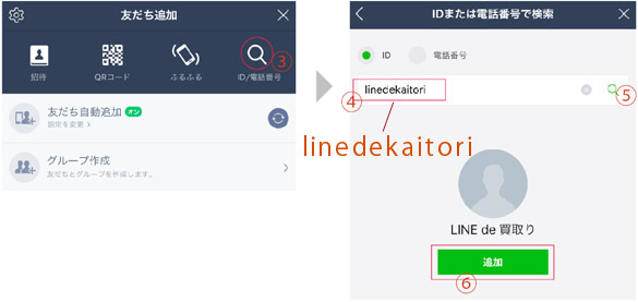 Cにお酒買取専門店のLINE ID「linekaitori」を入力してDを押します。LINE de買取りが表示されましたら、E追加を押します。これで準備完了です。