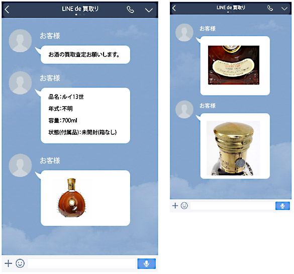 当店あてにお酒の「品名」、「年式」、「容量」、「状態、付属品」の情報と「写真」をお送りください。写真につきましては「全体」「ラベル」「キャップ」の3枚をご用意ください。